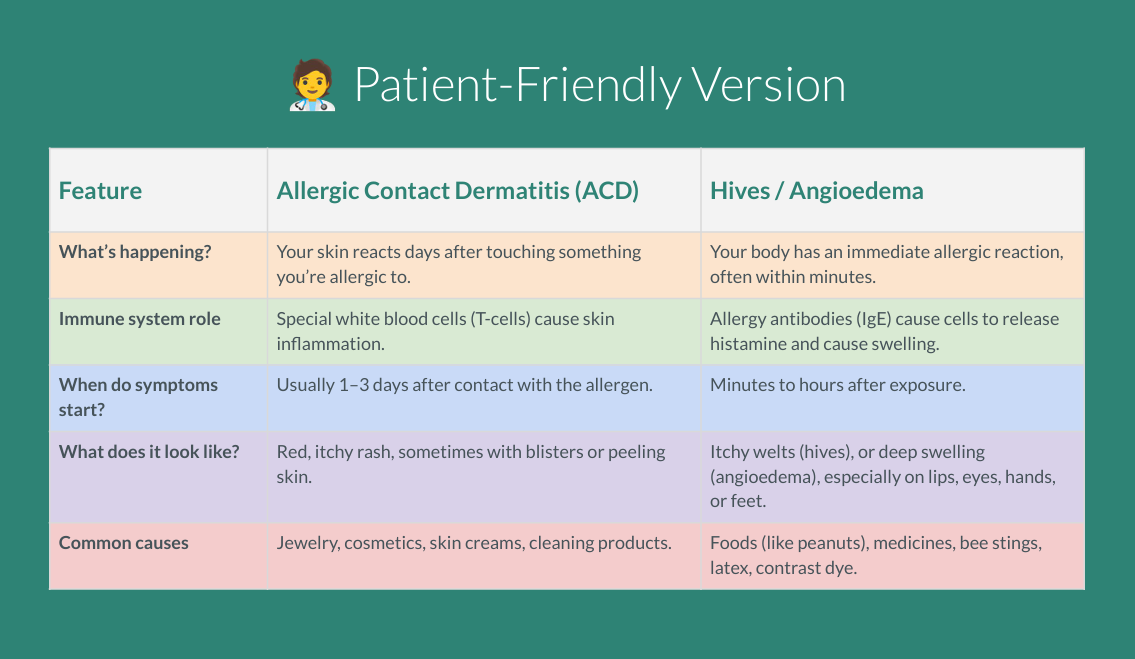 Allergic Contact Dermatitis (ACD) is a type of dermatitis (eczema) that happens when your skin reacts to something it has become sensitive to. Unlike irritant dermatitis (which comes from direct skin damage), ACD is an immune reaction—specifically a delayed (Type IV) hypersensitivity response. This means the rash usually shows up 24–72 hours after contact with the trigger.