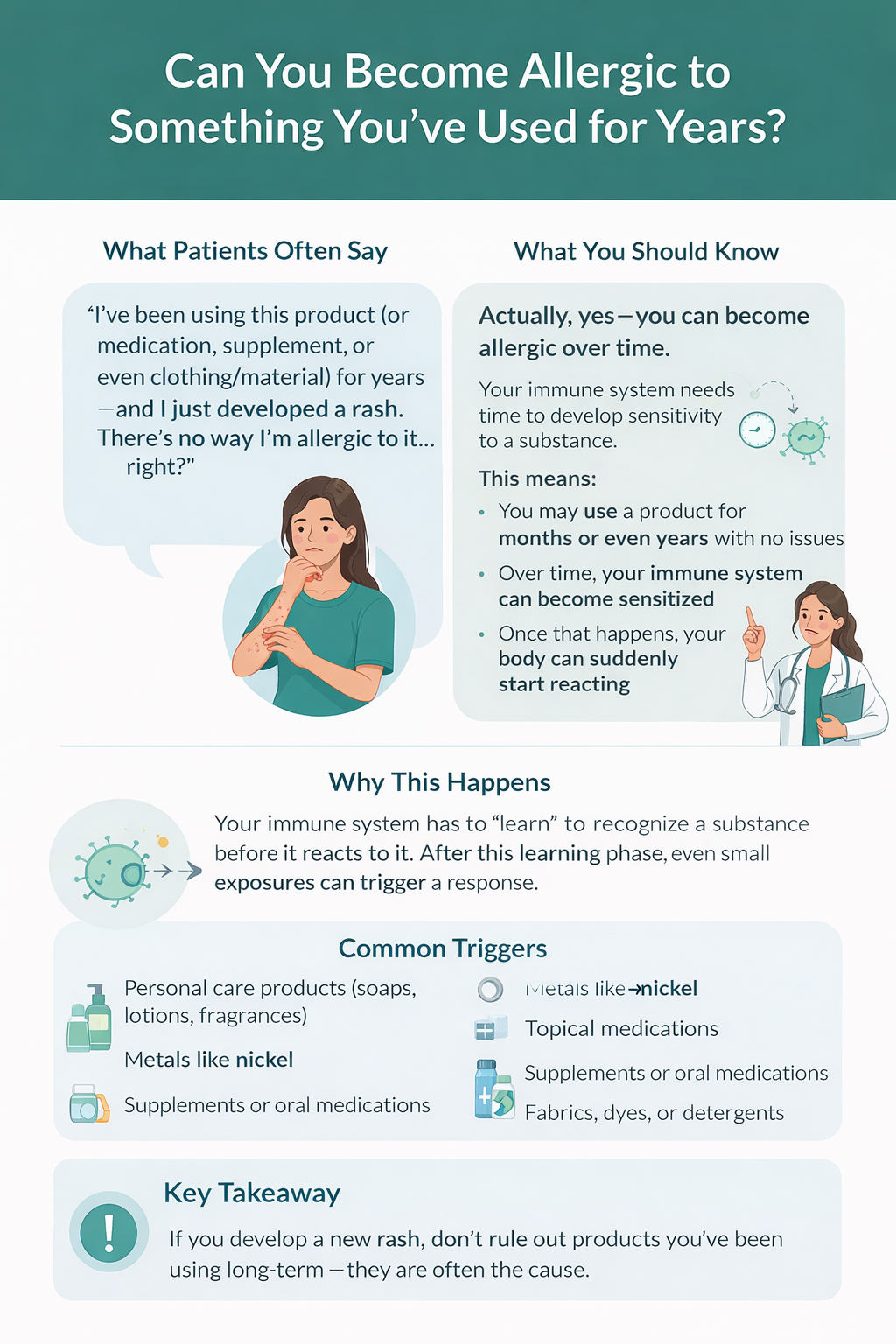 ACD develops after your body becomes “sensitized” to a substance. When you’re exposed again, your immune system (T-cells) triggers inflammation, leading to redness, itching, swelling, and sometimes blistering or scaling. It can happen to anyone, but repeated exposure and a weakened skin barrier increase the risk.