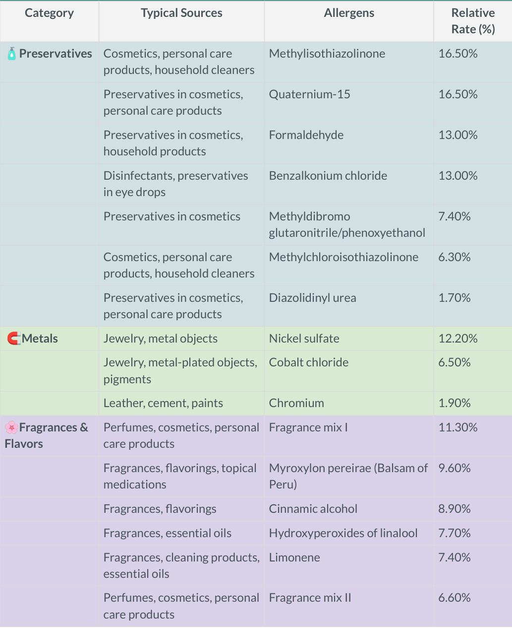 Common causes include fragrances, preservatives, nickel and other metals, rubber, dyes, certain plants (like poison ivy), and ingredients in skincare or personal care products.